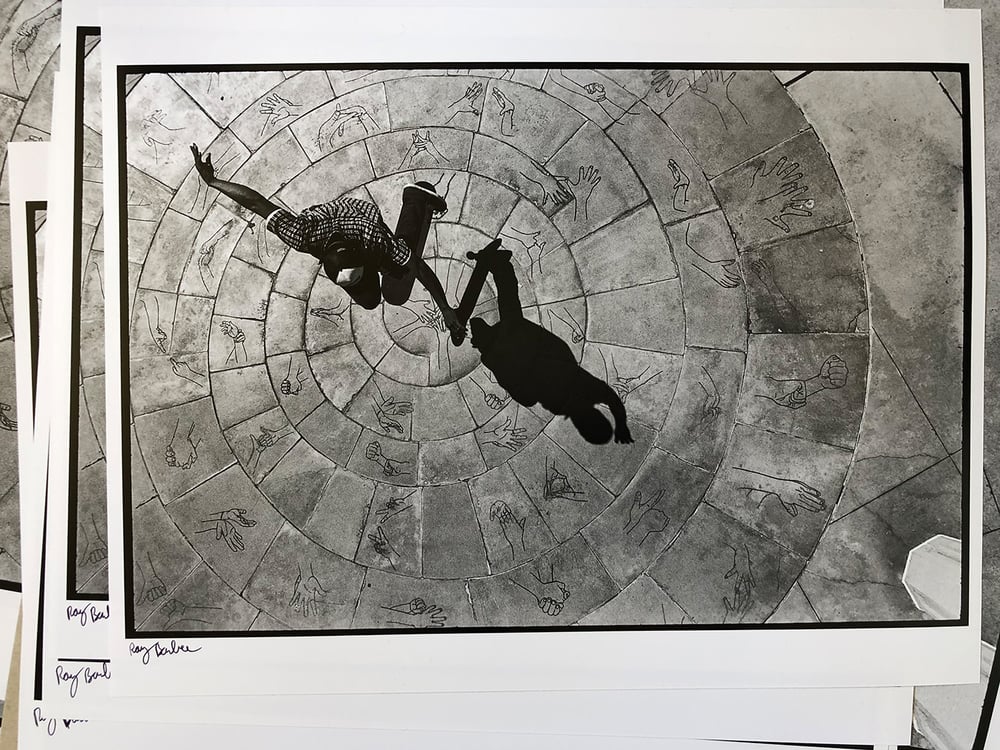 Street skating legend, musician, fellow photographer Ray Barbee doing a picture perfect backside 360 ollie on some rad hand formations in Los Angeles, Ca. Shot from above on 35mm black & white film. Printed on panchromatic, resin-coated true B&W